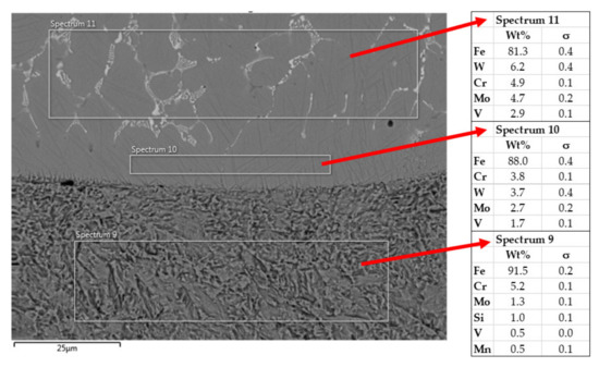 Based on EDX analysis, it is apparent that the materials were mixed in the melting zone, as evidenced by the presence of the elements V, Mo, W, and Cr, whose content in the mixing zone is lower than in the hardface but higher than in the base material (spectrum 10).