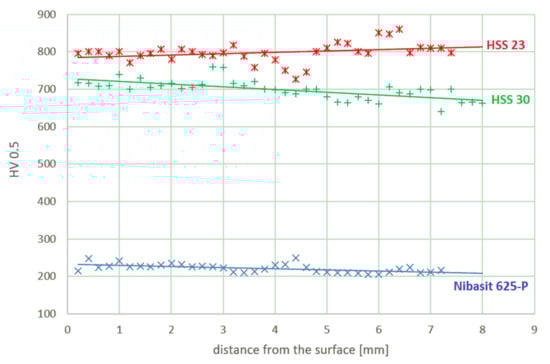 After the test, a graph based on the measured values was produced (Figure 21), which shows the hardness of the individual hardfaces as a function of the distance from the hardface surface.