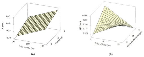 Figure 9a–c illustrates the GC of EDM with side flushing (GCsf) as a function of pulse on-time and current; pulse off-time and electrode rotation; and current and electrode rotation, respectively. In Figure 9a, GCsf was positively correlated to pulse on-time and electrical current. With side flushing, a longer pulse on-time and higher current generated higher temperatures and higher intensity discharge, enhancing machining efficiency. Nevertheless, the enhanced machining resulted in the rapid accumulation of debris and eventually wider GCsf, given the limited debris removal efficiency of side flushing [25]. GCsf became disproportionately wider as the depth-to-diameter ratio increased.