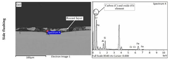 In Figure 13a, a recast layer was formed on the workpiece machined with side flushing. The recast layer was the deposition and re-settlement of melted material from the workpiece and electrode and carbon from the dielectric fluid [38]. The EDS compositional analysis showed the presence of carbon (46.31% w/w) and oxide elements (44.66% w/w) in great quantity, as shown in Table 14. The carbon and oxide elements induced the formation of a recast layer on the workpiece. Micro cracks were observed in the workpiece underneath the recast layer. The cracks were primarily attributable to the differential thermal contraction between the higher-temperature recast layer and lower-temperature workpiece [39].