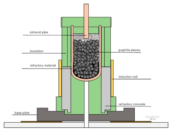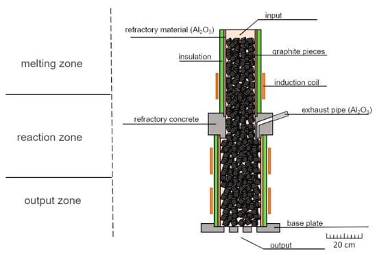 In order to treat the expected future waste stream from used LIBs, a technology with correspondingly high throughput rates is required. The currently pursued approach at the Chair of Thermal Processing Technology is based on a continuous reactor concept which currently exists as a pilot plant with a material throughput rate of 10 kg/h. Even if, according to initial findings from investigations of the LIB black matter, the design must differ from that used for sewage sludge ash and BOFS, the basic principle remains the same. Ponak [] describes the so-called InduRed reactor as an cylindrical arrangement of refractory materials filled with pieces of electrode graphite which allow a horizontal and radial homogeneous temperature distribution when heated by the induction coils, as seen in Figure 2.