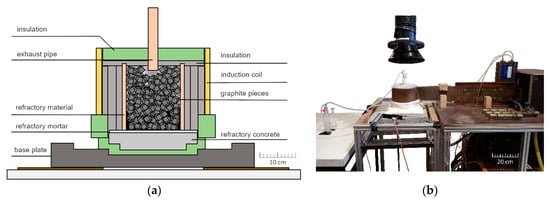 This is a cylindrical crucible with a half-arc bottom made of MgO. It was placed centrally on a refractory concrete structure in a way that only the lower part of the MgO crucible is within the induction coil. Appropriate insulation made of refractory matting should reduce the heat loss and thus the energy requirement and protect as far as possible against the ingress of false air from the environment. To be able to make a qualitative statement about the escaping gas during the test, an exhaust pipe made of Al2O3 was again implemented. The temperature was measured by a category S-thermocouple from below and in the reactor by two category K-thermocouples.