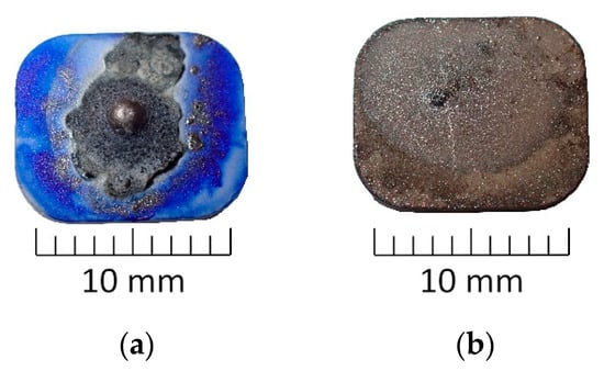 In a first step to determine the behavior of cathode materials from LIBs at temperatures above 1600 °C and under reducing conditions, experiments were performed in a heating microscope. Figure 5a provides a picture of the result of the experiment with the mixture with LCO. A strong dark blue coloration was observed on the platelet. This may be due to a reaction between the Al2O3 platelet and cobalt to form cobalt aluminate with its typical blue appearance. [] The product of the melting process under reducing conditions is a metal structure, which can be classified as strongly magnetic after examination with a magnet. This magnetism could also be detected in experiments with LFP, which is shown in (b). In contrast to the experiment described above, there is no blue coloration, but a brown to reddish appearance.