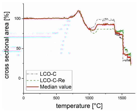 Results of the heating microscope of LCO‑C: trend of the cross-sectional area of the experiments LCO‑C and LCO‑C‑Re during heating and the median value of the both graphics.
