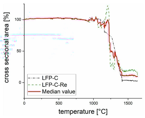 Results of the heating microscope of LFP‑C: trend of the cross-sectional area of the experiments LFP‑C and LFP‑C‑Re during heating and the median value of the both graphics.