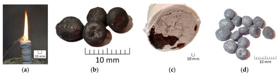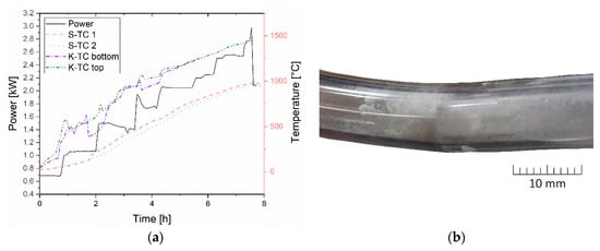 During the heating process, smoke development was particularly noticeable at an outside temperature of approximately 750 °C (approximate internal temperature of 1210 °C), which completely ignited after a short time. This flame, which is an indication of the reaction of phosphorus with oxygen [], could finally be detected constantly up to an outside temperature of approximately 860 °C (approximate internal temperature of 1310 °C) as shown in Figure 16a. During this time the acid in the gas scrubber changed its color to a brownish liquid. The results of the exhaust gas analysis can be taken from Table 6.