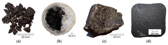 Products of the experiment LCO‑C in Design 1: (a) slag; (b) ceramic ring and mortar seen from the bottom; (c) metal; (d) powder.
