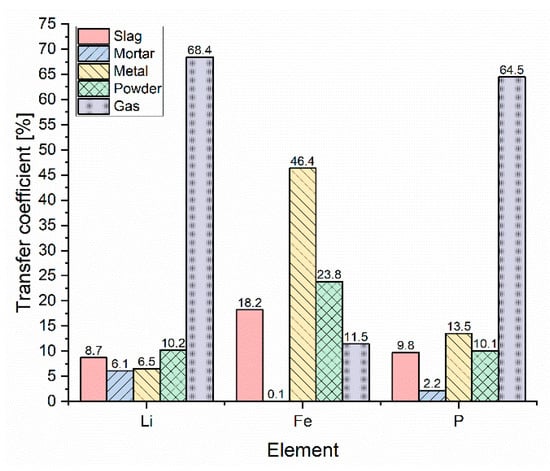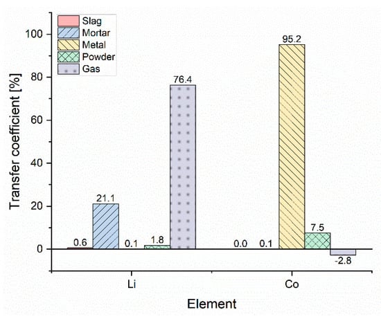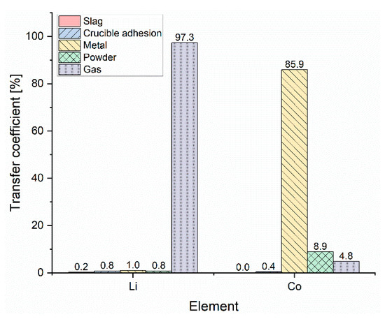 At this point it should be mentioned that the transfer coefficients determined must be seen as initial guide values and internal comparison values and must be confirmed accordingly by repeated experiments in the optimum reactor setup. Nevertheless, the trend was also observed in experiments with NMC and NCA, as described in Windisch-Kern et al. []. The result of the transfer coefficients in Figure 10 shows a Li removal rate of over 76% into the gas stream from the cathode material used. Based on the thermokinetic consideration of LCO by Kwon et al. [] and assuming that most of the Li has left the reactor during the phase of white smoke (approximately 1160–1340 °C), it can be assumed that it is Li2O. The transfer of over 21% Li into the mortar can be considered as an undesirable result. The percentage of Li in the slag is not negligible in the analyses (Table 2) with 5.6%, but due to the small quantity of slag it is insignificant for the total consideration with 0.6%. The small amount of Li in the metal (0.1%) is a great result with regard to the purest possible metal fraction. A further potential for improvement can be seen when considering the Li content of 1.8% in the powder, whereby this value can possibly be lowered with a longer holding time of the final temperature. The result of Co can be interpreted as extremely promising. Only 7.5% is found in the powder and 95.2% in the metal, which can be directly transferred for further use in the corresponding metal industry. The resulting difference to 100% can be explained by the extremely difficult sampling, especially the identification of the individual fractions and the subsequent weighing. At this point, the proportion in the slag and mortar can also be neglected with less than 0.1%. The comparison of these results with other processes is difficult at this point because the composition of the input material differs significantly from a real waste stream of LIB. Nevertheless, by using pure cathode material, without impurities such as Al or Cu, a value of the theoretically maximum possible removal rate of Li can be determined. Vest [] describes a Li2O transfer rate from the waste stream of LIB of 40.5% in their process based on an electric arc furnace. Even though a direct comparison with this value is not possible, the gap between Vest’s result and the theoretically possible value in this method shows an enormous potential.