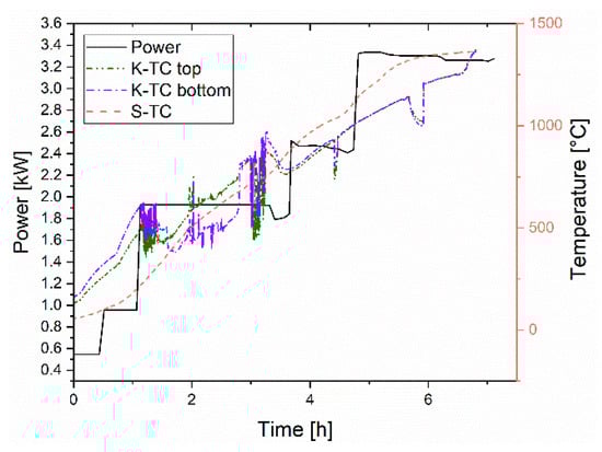 The first experiment, which is described in detail below, was carried out in Design 1. The entire experiment lasted nearly 8 h. Figure 8a shows the power input of the induction unit and the corresponding temperatures over the test time. Two type S‑thermocouples (S-TC 1 and S-TC 2 in Figure 8a) were used on the reactor surface and two type K‑thermocouples inside the reactor. The latter were initially installed at different heights in the reactor, one in the area of the first cube layer (K-TC bottom) and one in the upper area (K-TC top). In contrast to the S‑thermocouples, the measurement results of the K‑thermocouples are subject to considerable fluctuations due to melting of their insulation, influences of the material in the reactor, etc. However, an approximate temperature spread of the different thermocouple types of 500 °C could be determined up to the end.