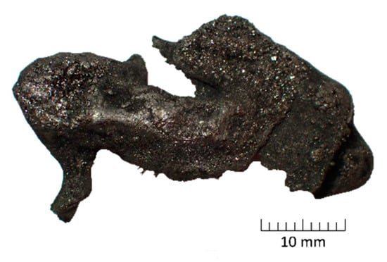 The fractions did not differ in their appearance from those in Figure 9a,c,d. Only the metal pieces were larger, as shown in Figure 12. Analysis of the metal fraction revealed a purity of Co of 93.9% with a negligible amount of 0.12% Li.