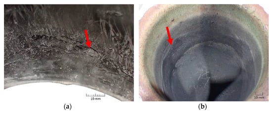 Besides this result, Design 2 also turns out to be a better choice when considering the interactions between the sample material and the reactor. As shown in Figure 14a, a massive attack of the reactor wall was observed in Design 1 (Al2O3) with ring diameter reductions of up to 0.2 mm. On the other hand, Figure 14b shows the reactor in Design 2 (MgO) after the experiment. From the difference between the weighing before and after the test, it is known that the reactor was over 81 g heavier afterwards. The theory of adhesion to the reactor can also be seen in the illustration, whose boundary is marked with the red arrow.