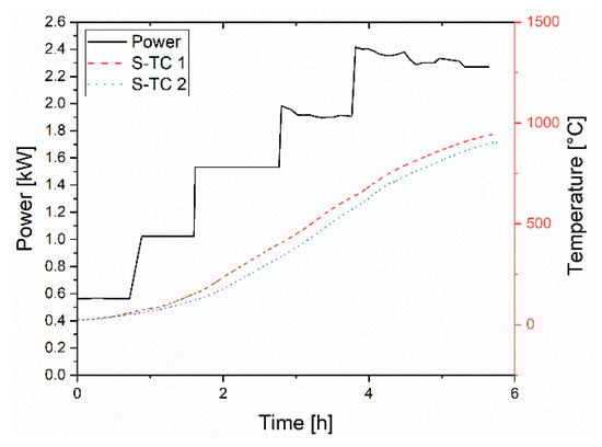 This factor is particularly important for long-term experiments in a continuous set-up. If the sample material and the Al2O3-ceramics are in contact for a longer period of time, this attack would lead to a destruction of the reactor. In addition to the advantages already mentioned, Design 2 also features a much simpler construction and therefore easier sampling. A drawback of Design 2 is the higher energy input required, which can be seen in the comparison of the power curve of Figure 8 and Figure 11. However, this can be solved by an improved positioning of the induction coil. Furthermore, the consequences of adhesions in continuous operation must be investigated.