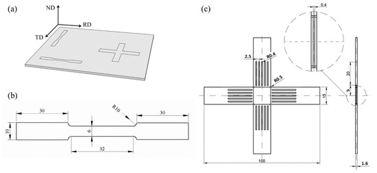 Uniaxial tensile specimens with gauge lengths and thicknesses of 32 × 0.4 mm along the rolling direction (RD) and transverse direction (TD) were cut from the plate, as shown in Figure 1a. Detailed dimensions of the uniaxial tensile specimen are shown in Figure 1b. To perform biaxial tensile tests, an improved cruciform specimen was developed according to standard BS ISO 16842 [29], as shown in Figure 1c, which has been proved to be able to provide homogeneous strain distribution in the gauge section [30]. The overall dimensions of the biaxial specimens are 100 × 100 × 1.6 mm with gauge area thickness of 0.4 mm. The cruciform sample was cut from the plate using wire-cut electric discharge machining, and then the surface of the cruciform sample was mechanically polished. The central zone was thinned by a milling machine. During all manufacture process, cooling liquid was used to avoid the effect of heat.