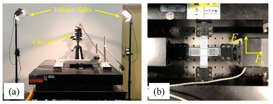 (a) DIC and biaxial tensile testing machine, (b) clamping device and speckle pattern (where Fx represents load at rolling direction and Fy represents load at transverse direction).