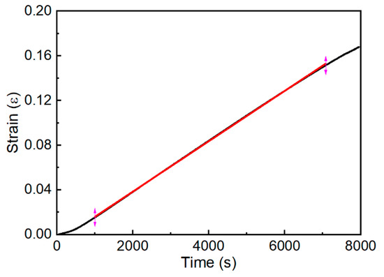 To investigate the tensile responses of CP-Ti at various load ratios, 9 fixed load ratios (Fx:Fy): 0:4, 1:4, 2:4, 3:4, 4:4, 4:3, 4:2, 4:1, 4:0 were introduced during biaxial tensile testing. The rolling and transverse direction were, respectively, defined as X and Y directions. The load ratio (Fx:Fy) represents the value of the applied load on the specimen at X and Y directions. It is worth noting that the biaxial tensile test of load ratios of 0:4 and 4:0 were replaced by uniaxial tensile tests along TD and RD directions. Table 1 lists the detailed biaxial tensile test data at various load ratios. On the other hand, to investigate the tensile responses of CP-Ti under various strain rates, displacement rate ranging from 0.001 to 0.1 mm/s were adopted. Here, displacement control mode was used because of the limitation of control mode of biaxial tensile machine. In this work, the displacement rate will be transformed to actual strain rate by the following method. During the whole test process, the relationship between time and strain measured by DIC system is plotted, where the slope of the stable stage was determined as the actual strain rate, as shown in Figure 3. The determined strain rates are listed in Table 2.