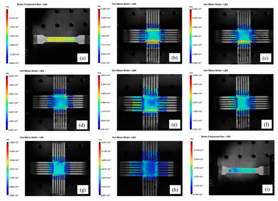 Strain contour plots at various load ratios (100 MPa): (a) 0:4, (b) 1:4, (c) 2:4, (d) 3:4, (e) 4:4, (f) 4:3, (g) 4:2, (h) 4:1, (i) 4:0.
