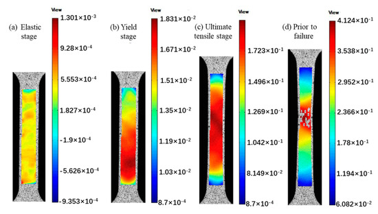 Strain contour plots of uniaxial RD tensile sample at various load steps: (a) initial stage, (b) yield stage, (c) ultimate tensile stage, (d) prior to failure.