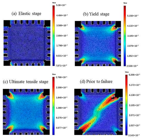 Strain contour plots of equi-biaxial tensile sample at various load steps: (a) initial stage, (b) yield stage, (c) ultimate tensile stage, (d) prior to failure.