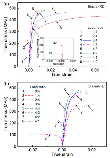 Figure 7 depicts the biaxial true stress-strain curves of CP-Ti at different load ratios. The true stress and true strain were, respectively, calculated by using the following equations [35,36]: