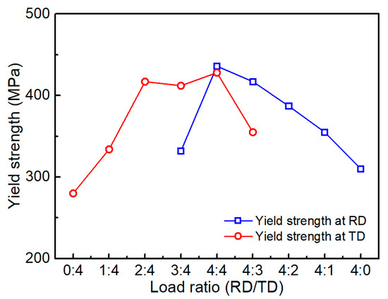 where σt is the true stress, F is the tensile force, expressed in N, ε is the engineering strain measured by the DIC system, Aeff is the effective cross-sectional area, expressed in mm2, which is taken as 7.5 mm2 in the present work [37], εt is true strain. It is observed from Figure 7 that the biaxial stress-strain curves show a gradual increase tendency as the load ratio transits from uniaxial tensile to equi-biaxial tensile, which is consistent with the observations in Figure 4. The variations of yield strength with respect to the load ratio at RD and TD directions are summarized in Table 1 and shown in Figure 8. Since for load ratio of 1:4 and 2:4 (4:1 and 4:2), strain accumulates negatively at RD (TD), therefore the yield strength is not presented for comparison. Looking at Figure 8, it is apparent that the transition of uniaxial tensile to biaxial tensile leads to the increase in yield strength. For example, in RD direction, the yield strength increases from 310 to 436 MPa when the load ratio transits from uniaxial RD to equi-biaxial tensile, up to 1.41 times. While the yield strength in TD direction increases 1.53 times. Interestingly, the yield strength at TD was observed to keep stable at load ratio of 2:4, 3:4, and 4:4, indicating that the stress at TD induced by the Poisson ratio comes to saturated after load ratio of 2:4. Remarkable improvement of yield strength under biaxial tensile loading may be ascribed to the combined effect of stress state and initial texture of CP-Ti. Since biaxial test involves only two orthogonal loading, deformation along thickness direction is restricted owing to the lack of stress in through thickness direction for hexagonal close-packed structure. The reason for this is strong basal and split-basal texture of the as-received material basal plane lying parallel to the plane of the sheet and biaxial loading is also parallel to the basal plane [22]. Therefore, remarkable improvement of biaxial yield strength was observed. Chen et al. [38] also found obvious improvement of yield strength of zirconium alloys under biaxial tension at room temperature.