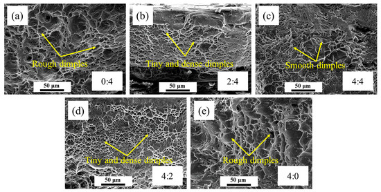 Fractographs of tensile failed specimens under various load ratios: (a) 0:4, (b) 2:4, (c) 4:4, (d) 4:2, (e) 4:0.