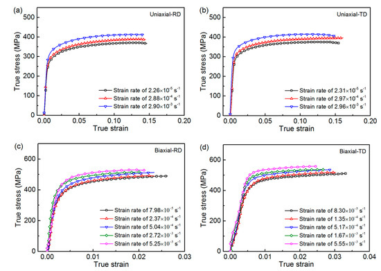 True stress-strain curve of CP-Ti at various strain rates: (a) uniaxial RD, (b) uniaxial TD, (c) biaxial RD, (d) biaxial TD.