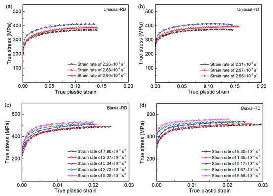 True stress-plastic strain curve of CP-Ti at various strain rates: (a) uniaxial RD, (b) uniaxial TD, (c) biaxial RD, (d) biaxial TD.