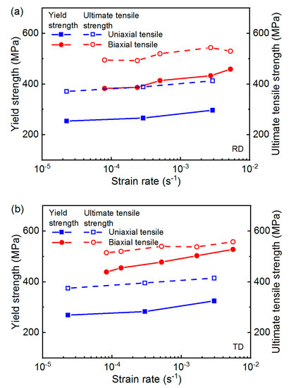 where εip (i = x, y) is the true plastic strain, Ci (i = x, y) is the slope of the elastic part of the true stress-strain curve measure in the biaxial tensile test, expressed in MPa, εi (i = x, y) is the true strain, σi (i = x, y) is the true stress, expressed in MPa. It is observed from Figure 10 and Figure 11 that the characters of stress-strain curves of biaxial tensile are similar with those of uniaxial tensile. The strain hardening behavior was enhanced by increasing strain rate either in uniaxial tensile or in biaxial tensile. Nevertheless, the elongation at biaxial tensile seems less than that at uniaxial tensile. To further elucidate the evolution of tensile properties of CP-Ti, the variation of tensile strength with respect to strain rate is listed in Table 2 and shown in Figure 12. From the figure above we can see that the yield strength and ultimate tensile strength all increase gradually with the increase in strain rate and display linear-log relationships with the strain rate. In addition, the biaxial strengthening of CP-Ti is also obvious. The yield strength and ultimate tensile strength in biaxial tensile are higher than that in uniaxial tensile, up to 1.6 times. Since the tensile plastic deformation is generally dominated by dislocation motion [42,43], the effect of strain rate on tensile response is reasonably ascribed to the difference in dislocation motion. Roth et al. [34] reported that the balance between the activities of different slip systems at the beginning of tensile plastic deformation significantly depends on the strain rate. The increase in strain rate reinforces the dominant slip systems, which in turn leads to accentuated plastic strain. Hence, the tensile strength dependence on the strain rate was observed.