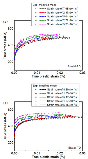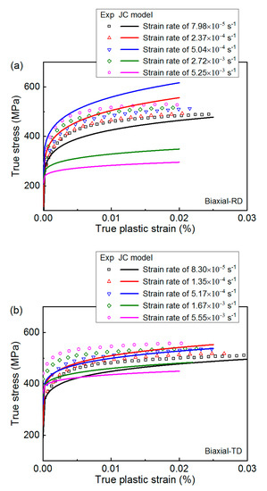 3.3. A Modified Johnson–Cook Model under Various Strain Rates of Biaxial Loading
