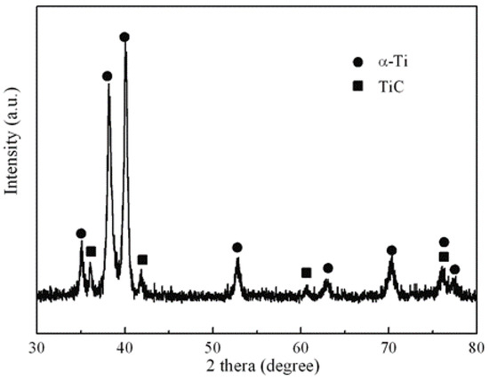 The X-ray diffraction pattern of the as-cast composite is illustrated in Figure 1. It can be seen that only two phases can be found in the present composite, which are α-Ti and TiC. The XRD result confirms that the in situ casting technique is feasible to prepare the composite, and TiC is the only carbide, although Zr content reached 9%.