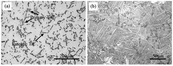 Figure 2 displays the characteristics of TiC and matrix in the as-cast composite. Through image analysis of micrograph in Figure 2a, the volume fraction of TiC is approximately 9.4%, very close to the designed value. TiC reinforcements were uniformly distributed in the composite macroscopically, but TiC clusters in some areas were observed (Figure 2a). Microstructural observation showed that TiC mainly grew in fine rod and strip shape (Figure 2a), which is identified as eutectic TiC [25]. Small amounts of TiC exhibited equiaxed or near-equiaxed shape, which corresponds to primary TiC [25]. Research indicated that TiC mainly displays equiaxed or near-equiaxed morphology in 10 vol.% TiC/Ti-6Al-3Sn-3.5Zr-0.4Mo-0.75Nb-0.35Si and 10 vol.% TiC/Ti-6Al-2Zr-1.5Mo-1V composites [19,20,21,22,23,24,25,26]. With the increase in Zr contents to 9% in this study, the volume fraction of primary TiC decreases. It is assumed that increasing Zr content in matrix can promote the precipitation of eutectic TiC. According to Ti-Zr binary phase diagram, Ti and Zr elements can be infinite mutual dissolution. Additionally, with the increase in Zr content, the liquidus temperature of Ti-Zr alloys decreases, which results in the degradation of supercooling degree ahead of the solid–liquid interface. The decrease in supercooling degree inhabits the precipitation of primary TiC. Relatively speaking, the precipitation of eutectic TiC is promoted. Typical fully lamellar structure with some extent of basket-weave characteristic in Figure 2b was formed during the solid-state transformation of β → α. The width of α lath was measured to be about 1.27 μm.
