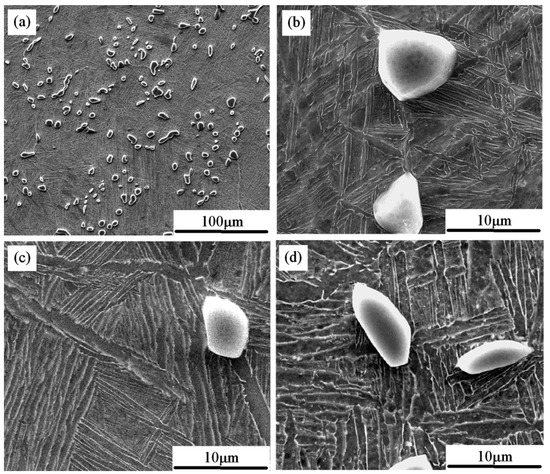 Figure 3 exhibits the microstructures of the composite after heat treatment. It can be seen from Figure 3a,b that as HT1 heat treatment was conducted on the composite, significant changes took place in TiC morphology and matrix feature. TiC with fine rod and strip shape almost cannot be observed after HT1 heat treatment, which evolved into equiaxed or near-equiaxed shape (see Figure 3a). It was reported that the spheroidizing of TiC reinforcement during high-temperature heat treatment promotes the formation of equiaxed TiC particles [27]. The reinforcements varied from 1 to 10 μm in diameter, and the average size was 7.2 μm in Figure 3b. Matrix microstructure in the composite via HT1 exhibited lamellar structure with obvious basket-weave characteristic. α phase size was refined remarkably in comparison with that in as-cast microstructure, and the average α lath width is about 0.38 μm.