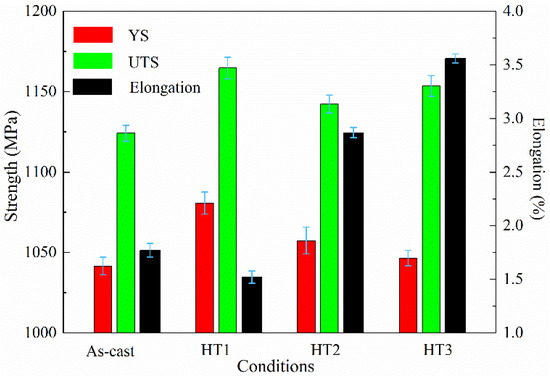 Figure 4 shows the ambient-temperature tensile properties of the composite before and after heat treatment. The results here are the average values obtained from repeated tests. In as-cast composite, the yield strength (YS) and ultimate tensile strength (UTS) are 1041.6 and 1124.2 MPa, respectively, and the tensile elongation is 1.77% (Figure 4). Obviously, UTS of as-cast composite is far higher than YS, indicating that the work hardening rate past yielding is high. As HT1 heat treatment was performed on the composite, YS and UTS are all enhanced evidently, reaching to 1080.8 and 1164.7 MPa, respectively. However, the tensile elongation decreases slightly (Figure 4). After HT2 heat treatment, YS and UTS decrease but ambient-temperature ductility increases compared to those of the composite via HT1. The composite via HT3 exhibits great elongation of 3.56%, although its YS is slightly low. Clearly, heat treatment plays an important role on the ambient-temperature tensile properties of the composite. The degradation of YS is accompanied by the enhancement of elongation after heat treatment (Figure 4).