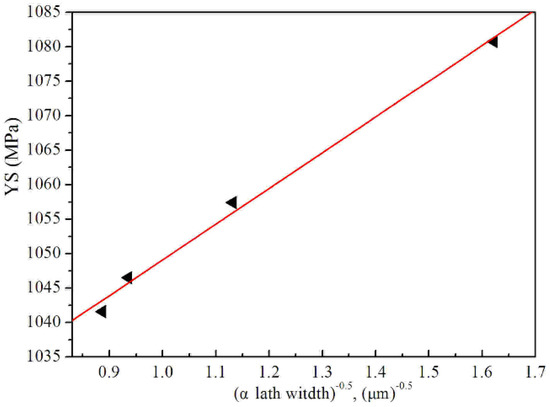 In order to further investigate the effect of α lath width on YS of the composite, the variation of YS with the inverse of square root of α lath width is illustrated in Figure 6 according to the Hall–Petch equation. The approximatively linear relationship between YS and the inverse of the square root of α lath width with the correlation coefficient of 0.997 is observable in Figure 6. The same method was used to examine the relationship between YS and α phase size in Ti-6Al-4V-B alloys [32]. This result adequately confirms that the enhanced YS after heat treatment is ascribed to the refinement of α lath.