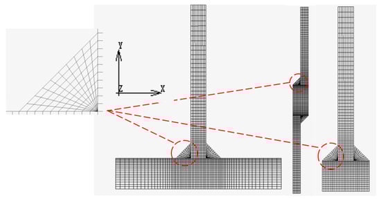 The linear elastic FE analysis was carried out using MARC 2017 (MacNeal-Schwendler Corporation, Los Angeles, CA, USA). Figure 1 shows the 2-D plane strain FE models. Only half of the T joint and the double-welded lap joint needed to be analyzed due to the symmetry. The total number of elements and nodes employed in the calculations of each situation were 2100 and 2230, 2000 and 2180, 1300 and 1421 for a T joint, a single-welded lap joint, and a double-welded lap joint, respectively. The consistency of Young’s modulus (200 GPa), the Poisson ratio (0.3), the convergence tolerance (0.1 of relative displacement), the thickness of the model (1 mm), the applied shear stress on the top (0.4 MPa), the displacement constraint (nodes on symmetric section fixed), the fillet weld sizes (5 mm), the thickness of the vertical plate (5 mm), the distance between the horizontal weld leg and the symmetric section (10 mm), the distance between the horizontal weld leg and the top (50 mm), and the meshing of the weld should be noted because it is more important than the accuracy of each FE model here.