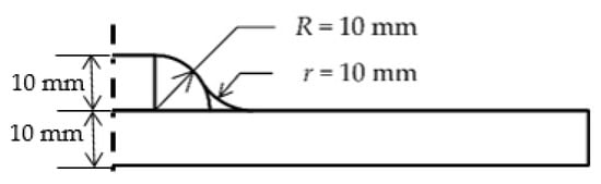 Note that the LCC is a different concept from strength: strength is a material parameter with the units of megapascals (MPa); LCC is the maximum load that the section of the joint can bear, with the units of megapascal meters squared (MPa∙m2), for example. The security of a welding structure requires that the LCC of the joint is equal to that of the base metal; this is a matter that concerns both the material performance and geometrical dimensions. Appropriately increasing the weld size of an undermatched joint can make the LCC of the weld equal to that of the base metal and improve the structural reliability. The shape optimization of the weld toe is imperative to eliminate the stress concentration caused by the increased weld size (weld reinforcement for a butt joint). A Baud streamline [], a Neuber catenary curve [], a Schnack transition curve [], C. Mattheck stretch triangle [], an elliptic, and a parabola are possible optimal shapes, which can be obtained by grinding [] or tungsten argon arc welding (TIG) dressing [,]. In this way, the failure mode of an undermatched joint turns to ductile fracture, where the joint is no longer the weakness of welded structure; thus, the effectiveness of the base metal HSLA is fully demonstrated.