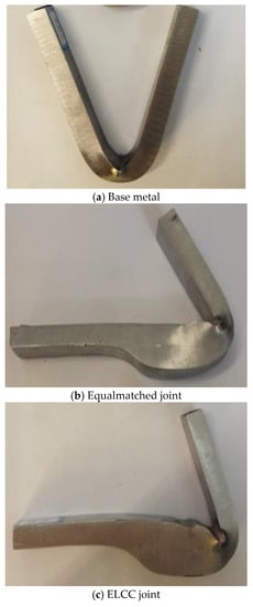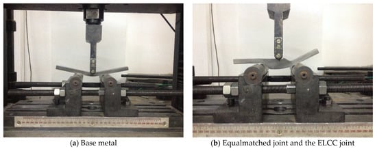 The wire-cutting and grinding were performed to obtain the designed shape. The prepared specimens are shown in Figure 4. Bending tests were conducted using an electron universal testing machine (CSS44300, Sinotest Equipment Company Limited, Changchun, China), as shown in Figure 5. According to ISO 5173:2000, the diameters of the supporting roller and the press roller were 30 mm and 10 mm, respectively, while the span was 2l = 80 mm. The test temperature was 20 °C and the loading rate was 2 mm/min. There were no specific standards for single-welded lap joint under out-of-plane bending to follow; however, for convenience of comparison, the experiment was conducted and recorded in the same manner as that of the base metal, where the ELCC joint and the equalmatched joint were affected by shear equally. Different supporting rollers (with the diameter of 30 mm and 20 mm, respectively) were once used to eliminate the horizontal components of the bending force but failed because the deformation of the lap joint became asymmetrical as the experiment went on.