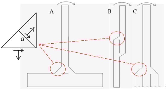 In fact, the joints may also work in an elastoplastic or plastic state. However, this will not change their physical and mechanical similarity. Take the plastic state for example, where the plastic moment limits transmitted by the stretched weld of situations A and C were the same (Lσy × 50 mm2, where L represents the length of the weld, and σy represents the yield strength of the filler material), and so were those of situations A0, B, and C0 (Lσy × 25 mm2).