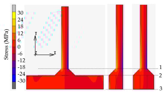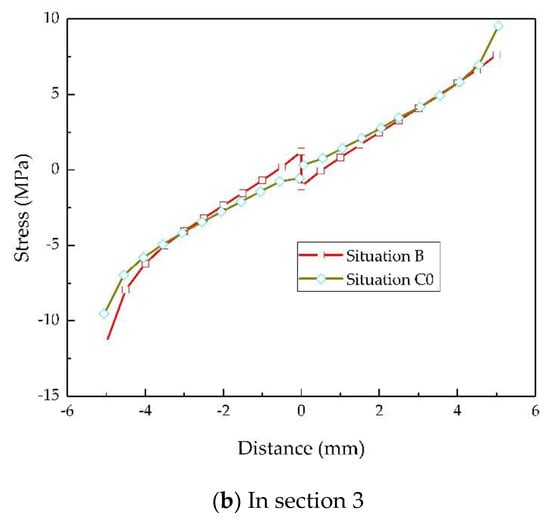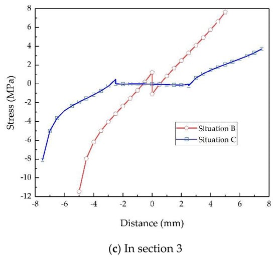 As shown in Figure 9a, the curve of situation A’s section 1 and that of situation C’s section 1 coincide with each other, i.e., the stress distributions of situations A and C on section 1 are exactly the same, and the difference from that of situation B is very slight. If the stress in the vertical plate, which has little relation to the LCC of the weld, is ignored, it can be considered that the stress distributions of situations A and C in Section 2 are basically identical, while that of situation B is distinctive, as Figure 9b shows. Furthermore, the average stress of the stretched side of the weld was 2.29 MPa for situation A, 3.18 MPa for situation B, and 2.06 MPa for situation C. The load transmitted by the weld in situation C differed by only 10% from that in situation A, and it should be emphasized that the load in situation C was lower. Therefore, the load-carrying characteristics of the double-sided lap and T joint were basically the same; thus, their strength calculation methods should be the same. The average stress of situation B was significantly greater than that of situation A. Furthermore, as shown in Figure 9c, the stress distribution in section 3 was also significantly different from that of situation C.