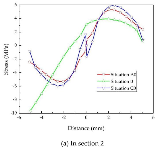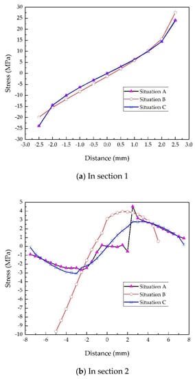 The stresses in the vertical direction are shown in Figure 7, and the enlarged view of the stretched side of the welds are shown in Figure 8. A high degree of similarity is observed, particularly between situations A and C. For further quantitative analysis, the stress distribution on sections selected in Figure 7 is given in Figure 9. The center of each section is located at x = 0.