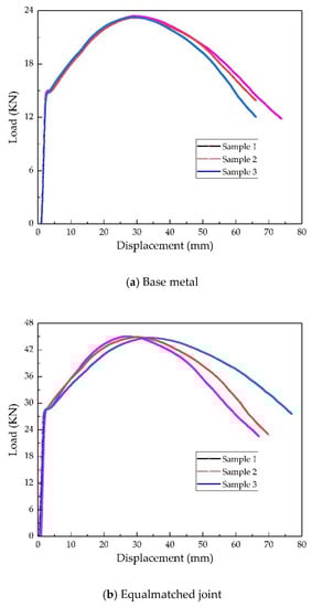 Filler materials with lower strength and higher plasticity and toughness are used to get a high-quality joint with a lower preheating temperature or without preheating operations [,,,]. The strength of such an undermatched joint is between those of the filler materials and the base metal because the weld is strengthened metallurgically and is protected from deformation by the surrounding base metal [,]. As the weld thickness decreases, the strength increases but the plasticity decreases significantly. The fracture mode of the joint is a brittle fracture without obvious plastic deformation. Most undermatched joints are still the weakest position in a welding structure because of their insufficiency in load carrying capacity (LCC).