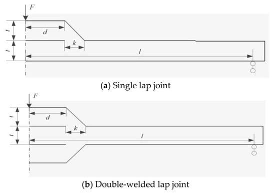 Equations (15) and (17) are the realizing conditions of ELCC for a single lap joint and a double-welded lap joint, respectively. For a traditionally designed lap joint with , Equations (15) and (17) can be rewritten as:
