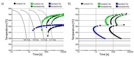 Time–temperature graph for steel with chemical composition (% by mass): C—0.44, Si—0.16, Mn—0.49, P—0.006, S—0.002, Al—0.04, Cr—0.83, Cu—0.02, Co—0.02, Ni—2.01, Mo—0.14, B—0.0021, Ti—0.008, V—0.008; austenitized at temperature TA = 787 °C; assumed size of the former austenite grain—10 µm. (a) Constant cooling—CCT. (b) Isothermal cooling—TTT. Assigned temperatures for individual transformations, phases and components of the structure: pearlite −720 °C, ferrite −736 °C, bainite −531 °C, martensite (50%) −258 °C, martensite (90%) −173 °C, MS = 294 °C.
