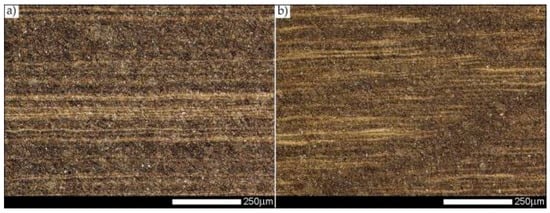 Hardox Extreme steel microstructure in the delivery state with clearly distinct banding pattern resulting from thermomechanical rolling. (a) Longitudinal orientation—hardness 60 HRC. (b) Transverse orientation—hardness 61 HRC. Light microscopy, etched with 3% HNO3.