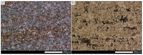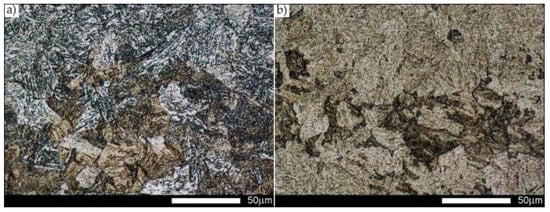 Hardox Extreme steel microstructure in normalized conditions. (a) Longitudinal orientation—hardness of 38 HRC. (b) Transverse orientation—hardness of 38 HRC. In both cases, quenched structures exhibit wide structural diversity with a great percentage of diffusion structures. Light microscopy, etched with 3% HNO3.