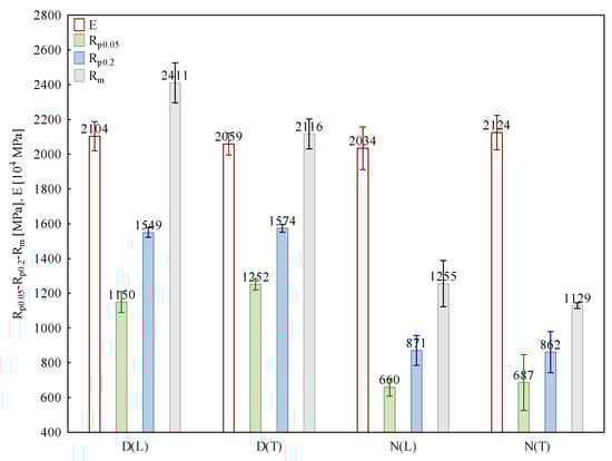 The tensile tests were conducted in ambient temperature on rectangular, proportional fivefold samples, as per PN-EN ISO 6892-1:2020-05. A material testing system MTS 810 (Mts Systems Corporation, MN, USA) was used with an extensometer, measurement base length L0 = 25 mm. During the tests, the stretching rate was controlled by the stress increase rate. Next, the following were determined for each sample: Young’s modulus (E), elastic limit (Rp0.05), yield strength (Rp0.2), tensile strength (Rm), the percentage reduction of area (Z) and percentage elongation (A5) after tear. The strength indices are the arithmetic averages of the results obtained from at least five samples per each measurement point. Additionally, on the basis of the results obtained for particular samples, measurement errors were calculated in the form of standard deviation.