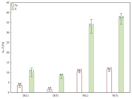 Normalization led to significant reductions in strength properties. Taking into account the orientation of forming process, the value of strength decreased by 47–48%, the yield strength by 44–45% and the elastic limit by 43–45%. Simultaneously, it resulted in increases in the parameters determining plastic properties, i.e., elongation and reduction in area by 200–653% and 228–360%, respectively (Figure 7).