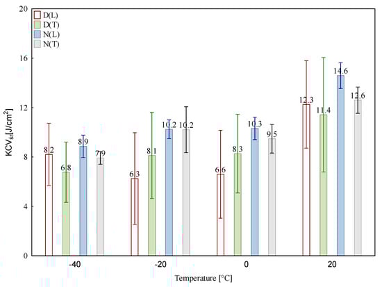 The impact tests were done using a hammer, Charpy Zwick Roell RPK300 (Zwick Roell Gruppe, Ulm, Germany). The initial energy value was 300 J, as per PN-EN ISO 148-1:2017-02. The samples used in the tests were square with V-shaped notches. On the basis of the research done at +20, 0, −20 and −40 °C temperatures, the arithmetic average of at least five samples and the standard deviation for the impact tests were determined for each measurement point. Subsequently, fractographic analyses were conducted on selected fracture surfaces using a scanning microscope (SEM) JSM-6610A (JEOL Ltd., Tokyo, Japan). The tests were done at an accelerating voltage of 20 kV. Observations were made in the material contrast, using SE detectors (JEOL Ltd., Tokyo, Japan). On the basis of the recorded images of crack surfaces, the percentage share of plastic zones was calculated using free image analysis free software ImageJ version 1.52a (National Institute of Mental Health, Bethesda, MD, USA).