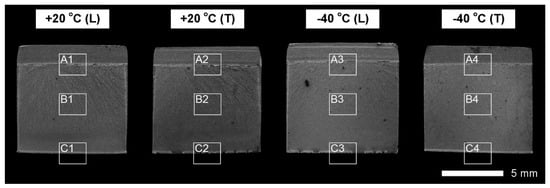 In impact tests, it is extremely essential to analyze the nature of a fracture, because the adopted criterion of 35 J/cm2 (discussed above) corresponds with the occurrence of a ductile and brittle fracture. Figure 9 and Figure 10 present the macroscopic images of fractures in the analyzed steel after the impact strength test at temperatures of +20 and −40 °C. The areas which were analyzed in detail later in the research are marked (Figure 11, Figure 12, Figure 13, Figure 14, Figure 15, Figure 16, Figure 17 and Figure 18). In each case, the fractures in the delivered and normalized states exhibited the lack of plastic deformation and practically no participation of ductile side zones and the zone below the notch. In the delivered state, the participation of ductile zones was from about 5% (longitudinal orientation, impact strength test at −40 °C) to about 8% (longitudinal orientation, impact tests at +20 °C). After normalizing, the plastic zone was practically not observed. This situation resulted in the reduced impact strength of this steel in the whole range of test temperatures.