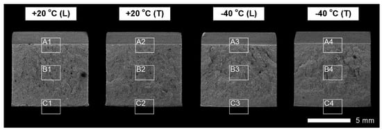 Macroscopic image of fractures in representative specimens of Hardox Extreme steel in delivery state: L—longitudinal orientation, T—transverse orientation; frames are used to mark: A—zone below the notch, B—central zone, C—final-fracture zone. SEM non-etched state.